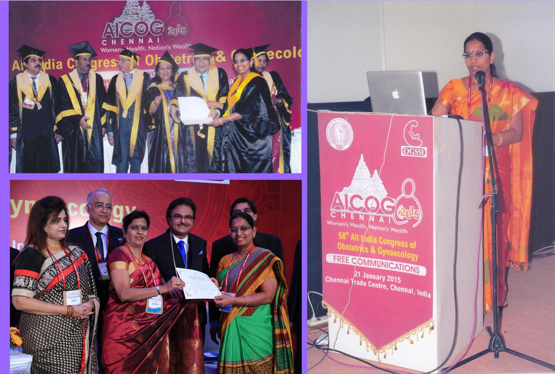 At the annual conclave, she was awarded the OGSSI-Dr.C.S.Dawn Prize for her presentation on the theme Safe Surgery Saves Lives and, was elected a Fellow of the Indian College of Obstetricians & Gynaecologists (FICOG). (2015)